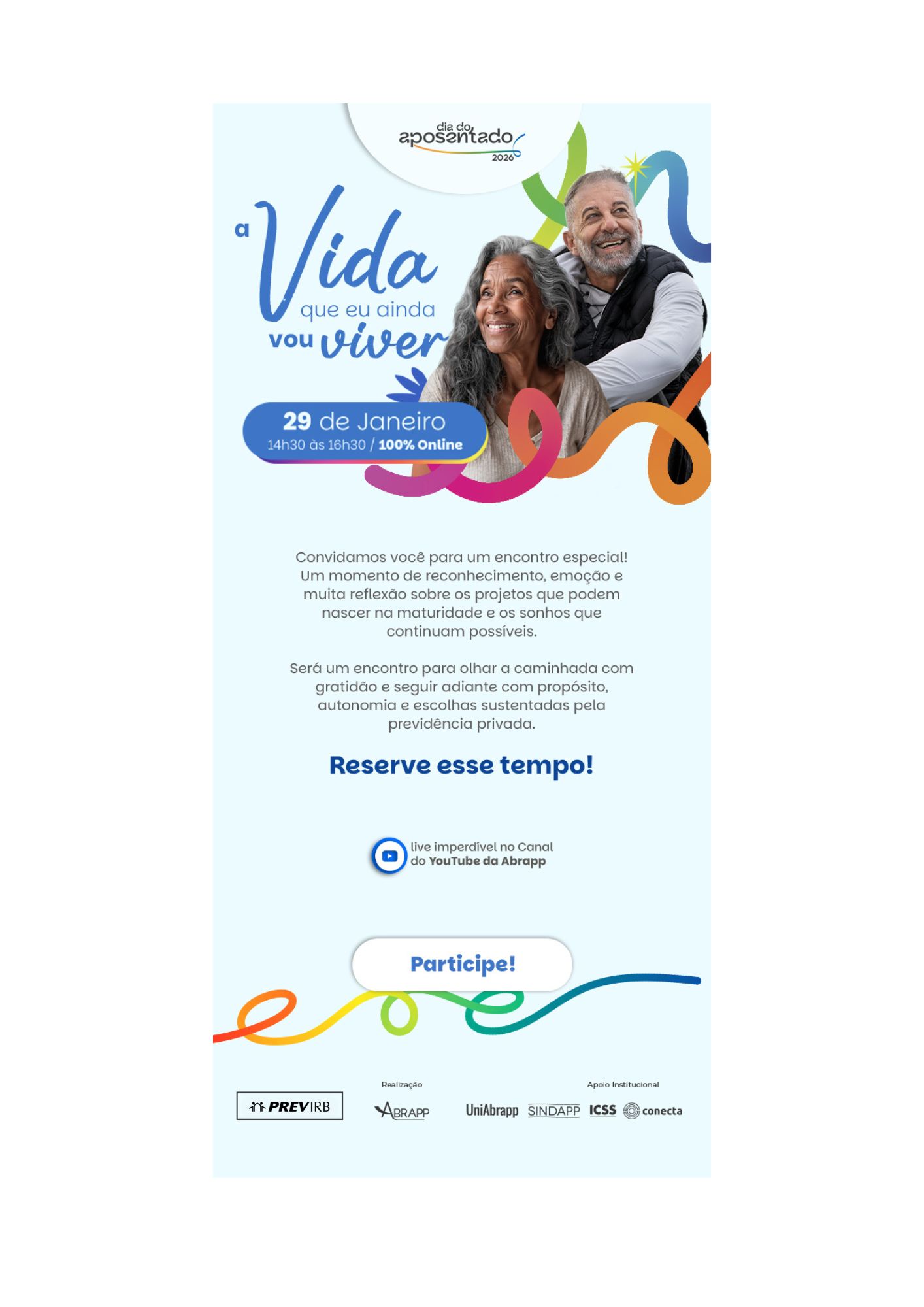 No dia 29 de janeiro, das 14:30 às 16:30, a ABRAPP (Associação Brasileira das Entidades Fechadas de Previdência Complementar) realizará mais uma edição de seu tradicional evento em celebração aoDia do Aposentado. O evento será totalmente online e transmitido diretamente pelo canal do YouTube da Abrapp.